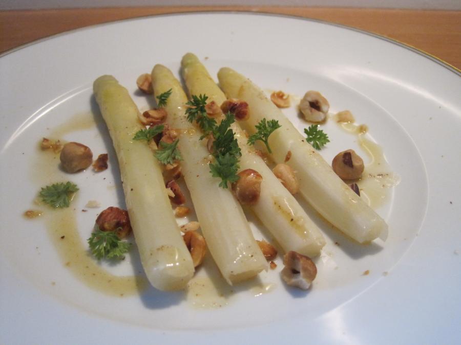 Skræl aspargesen, og knæk det nederste af. Samt dem i letsaltet vand i ca. 5 minutter. Afdryp asparges, og anret dem herefter på varmede tallerkener, dryp brunet smør fra det øverste lag af smørret over, drys med nødder og persille og server.