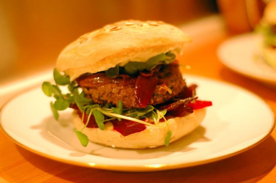 Burger med bagte rødbeder, løgkompot og rygeostmayonaise